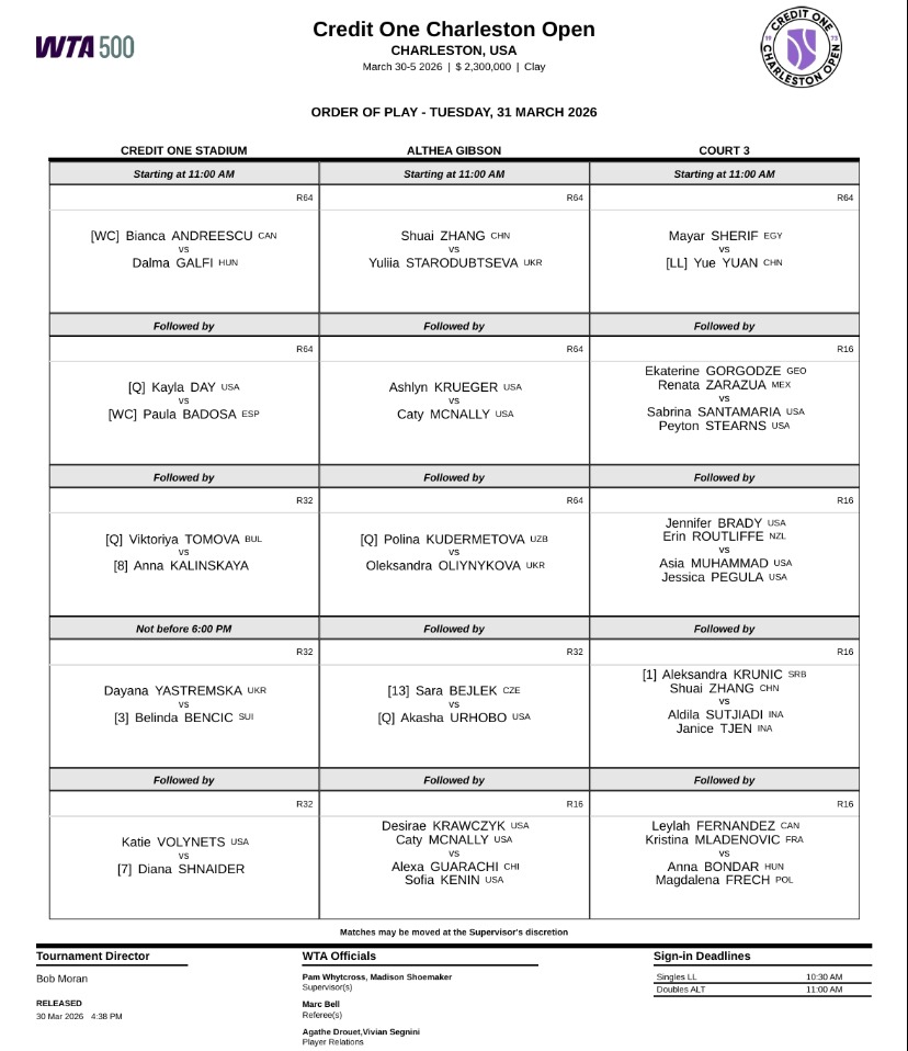 WTA500查尔斯顿站,在资格赛决胜轮告负的中国选手袁悦因梅尔滕斯赛前退赛,作为幸运落败者入围正选,她首轮的对手是谢里芙。袁悦和张帅都将在北京时间今晚23:00出战女单首轮比赛。
